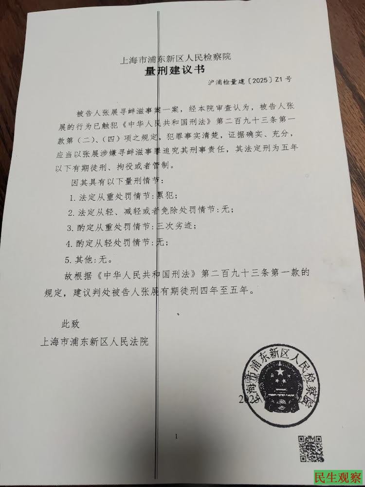 【民生观察2025年8月25日消息】张展再次被捕即将满一年,羁押期间多次被强制做精神病鉴定,其罪名为寻衅滋事罪,目前案件仍在等候上海市浦东新区法院的开庭通知。上海浦东新区检察院对其量刑建议4-5年。