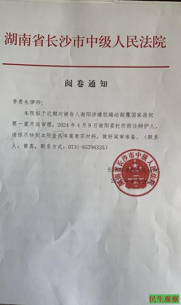 “李贵生律师:本院拟于近期对被告人谢阳涉嫌犯煽动颠覆国家政权罪一案开庭审理,2024年4月9日谢阳委托你担任辩护人,请你尽快到本院查阅本案卷宗材料,做好开庭准备。(联系人:黄真,联系方式:0731-85798335)”