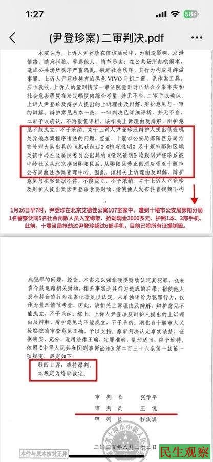2025年9月4日早9时,尹登珍被控寻衅滋事案二审在十堰市看守所秘密宣判,判决结果维持原判4年6个月。