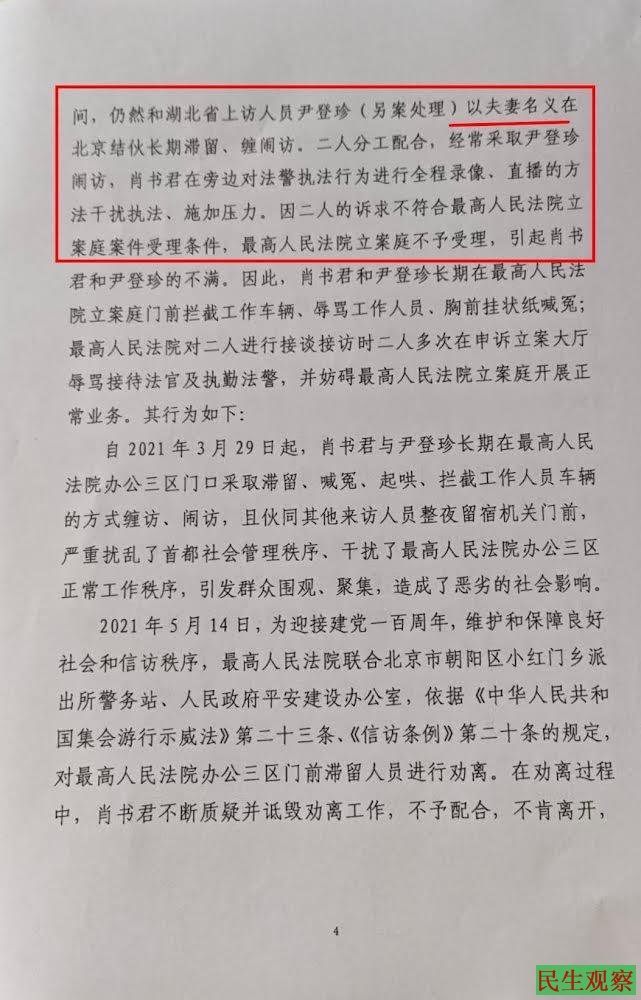 判决书中称“肖书君和尹登珍以夫妻名义在北京结伙长期滞留、缠访闹访”。但事实是二人自2013年相恋共同生活12年,因湖北十堰、黑龙江同江两地政府阻挠导致至今未能登记结婚。