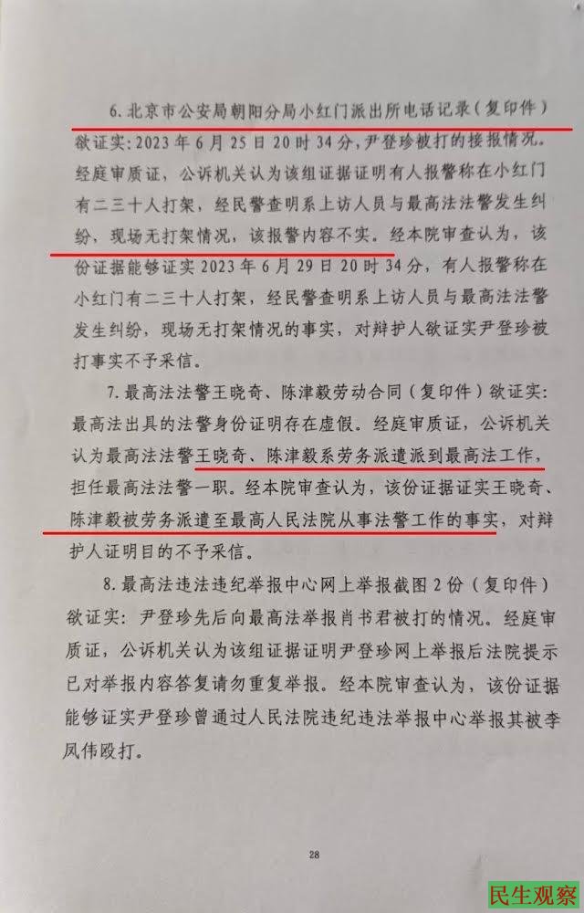 2、2023年6月29日,尹登珍、肖书君被最高人民法院多名保安殴打,导致尹登珍肋骨骨折、全身多处伤,肖书君全身软组织多处受伤、冠心病、癫痫病发作被送进医院抢救。同江市人民法院采信病例报告,但仍否认两人在最高人民法院被殴打,并出具北京市公安局朝阳分局小红门派出所提供的证据称“民警查明系上访人员与最高法法警发生纠纷,现场无打架情况”。