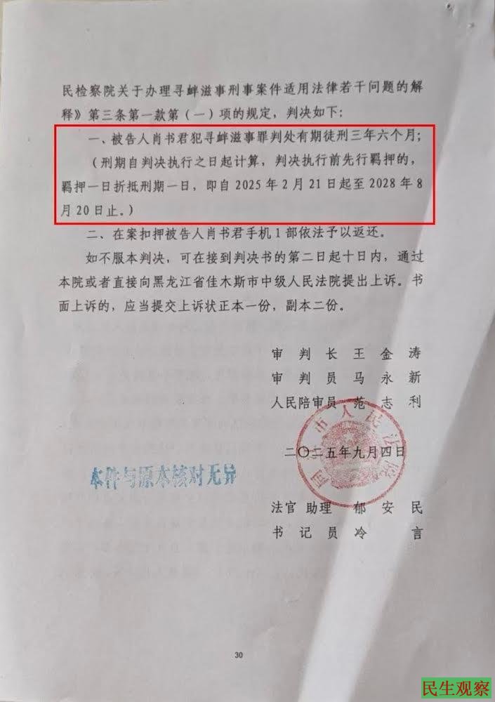另外,尹登珍丈夫肖书君“寻衅滋事罪”案的最新进展为,2025年9月4日,尹登珍二审秘密宣判当日,肖书君“寻衅滋事罪”案一审宣判,被判处有期徒刑3年6个月,自2025年2月21日起至2028年8月20日止。