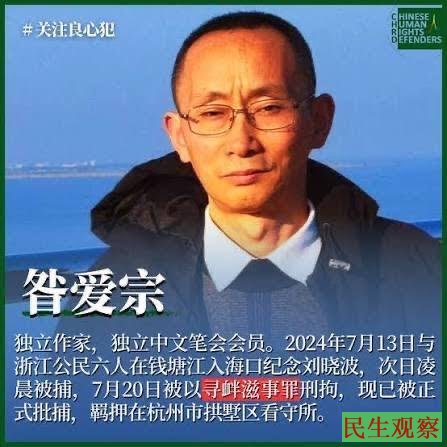 据了解,昝爱宗,基督徒、独立中文笔会会员、自由作家。2022年中共二十大期间曾被杭州拱墅区公安政保安排,由东新派出所警察随同离开杭州到台州同吃同住,出入跟随。