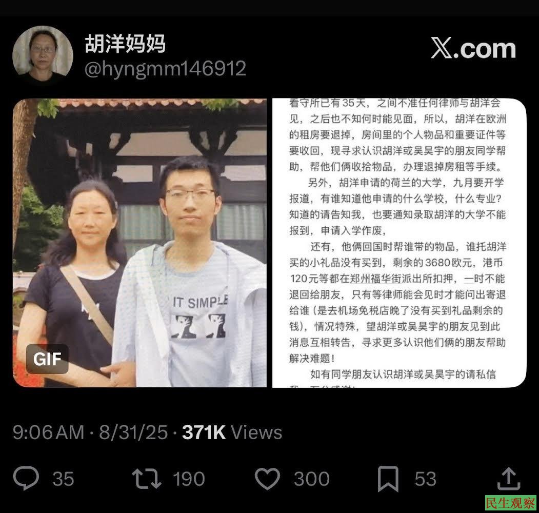 【民生观察2025年10月13日消息】荷兰留学生胡洋暑假回国探亲,被郑州警方以寻衅滋事罪刑拘逮捕羁押至今。期间家属聘请律师前往看守所会见被拒,家属要求送衣物遭拒。家属网上发声,被强制要求删帖。