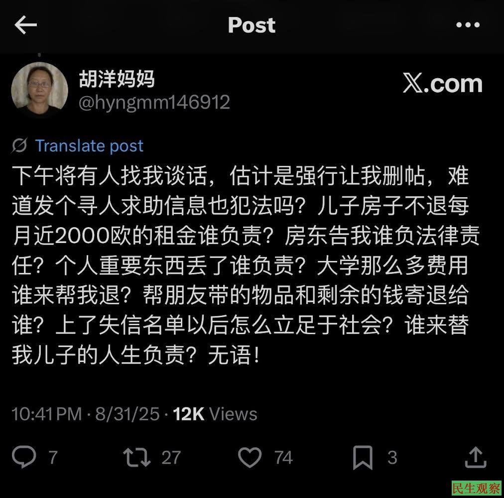 当日下午就有人找到胡洋母亲谈话,强行要求她删帖。胡洋母亲表示:“难道发个寻人求助信息也犯法吗?儿子房子不退每月近2000欧的租金谁负责?房东告我谁负法律责任?个人重要东西丢了谁负责?大学那么多费用谁来帮我退?帮朋友带的物品和剩余的钱寄退给谁?上了失信名单以后怎么立足于社会?谁来替我儿子的人生负责?无语!”