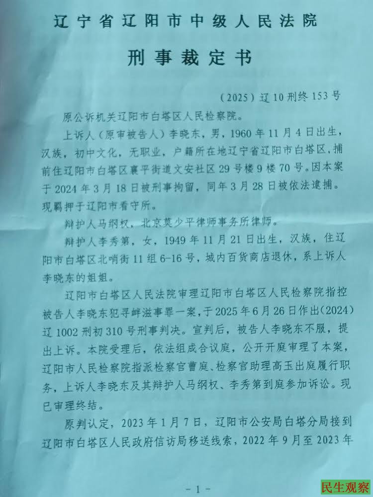 【民生观察2025年10月27日消息】辽宁省辽阳市白塔区维权人士李晓东一审被以寻衅滋事罪判刑二年,其不服判决递交上诉申请。近日案件二审宣判:驳回上诉,维持原判。