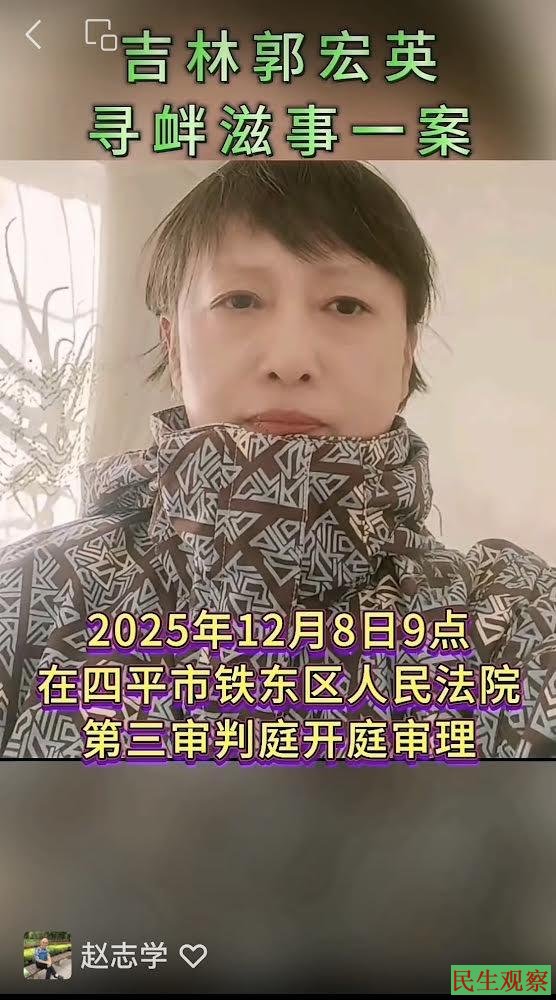 【民生观察2025年12月5日消息】本网获悉,吉林四平维权公民郭宏英被控涉嫌寻衅滋事一案,将于2025年12月8日在四平市铁东区人民法院开庭审理。