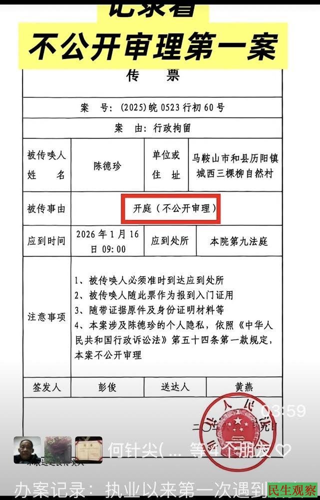 【民生观察2026年1月18日消息】近日,安徽和县维权人士陈德珍不服和县公安局行政拘留一案,在和县法院进行了不公开开庭,当日来自全国各地的旁听人员前往和县法院要求旁听时,均被法院拒之门外。
