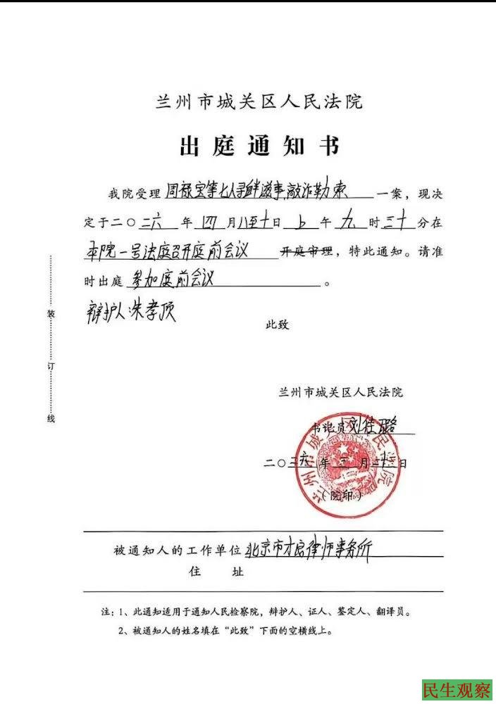 甘肃兰州市城关区法院通知律师,景树仁案将于2026年4月8日至10日,召开庭前会议。