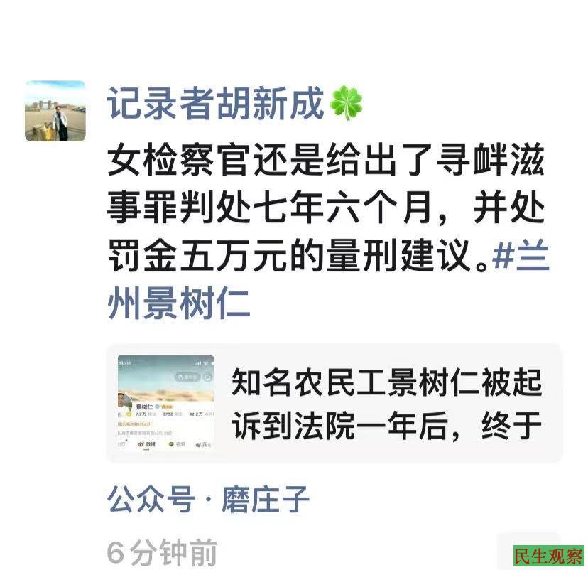 【民生观察2026年4月1日消息】甘肃兰州公益人士景树仁因微博转发农民工讨薪相关事件,于2024年3月被兰州警方以涉嫌寻衅滋事罪刑拘关押至今,案件被起诉至法院一年后,近日其辩护律师朱孝顶接到法院通知,该案将于近期召开庭前会议。