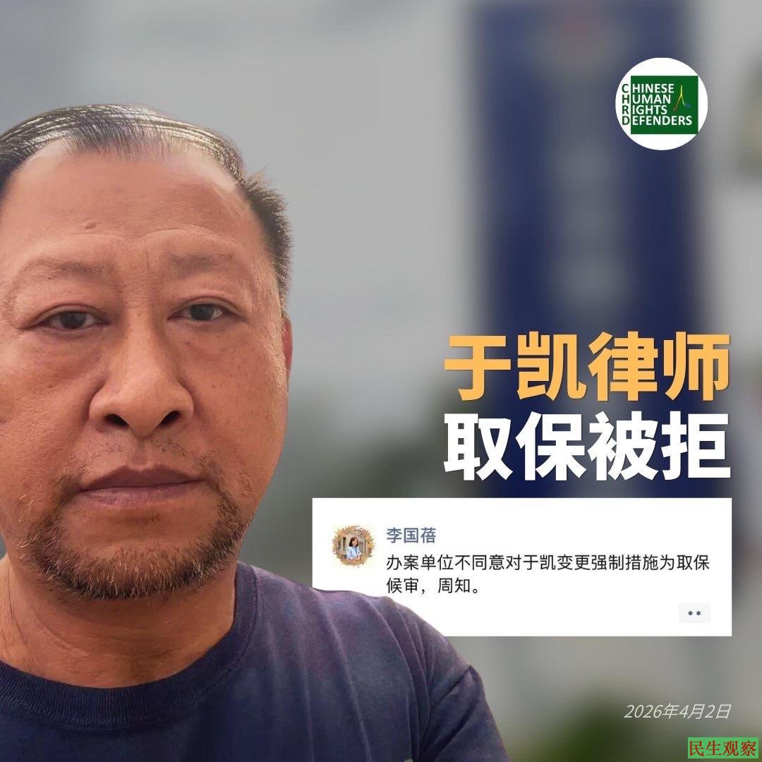 【民生观察2026年4月3日消息】山东晓临律师事务所主任于凯律师因涉嫌扰乱公共秩序,被北京西城区执法办案中心带走调查,后被采取刑事强制措施,目前羁押在西城区看守所。据称,其被刑拘原因是向法工委提议废除寻衅滋事罪。近日,于凯代理律师李国蓓申请对其取保候审遭拒。