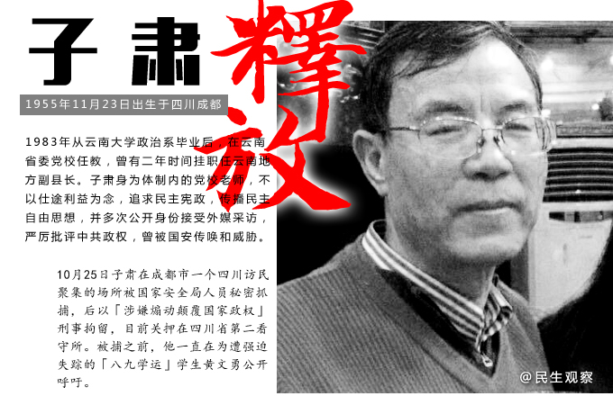 子肃身为体制内的党校老师,并曾有二年时间挂职任云南地方的副县长,在目睹官场的黑暗腐败后,不以仕途利益为念,而以追求民主宪政制度为己任,活跃于微信群传播民主自由思想,并多次公开身份接受外媒的采访,严厉批评中共政权,在云南省委党校任职经济学教师时,就被国安传唤和威胁。