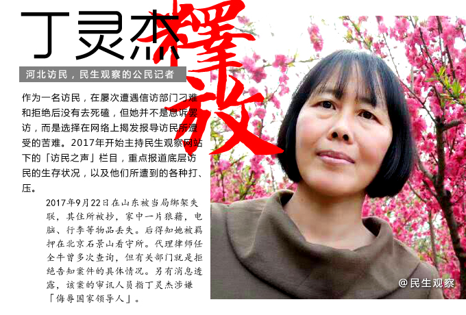作为视频上传者而遭到抓捕的丁灵杰是来自河北的人权捍卫者,民生观察的公民记者。2017年,丁灵杰主持民生观察网站下的“访民之声”栏目,重点报道底层访民的生存状况,以及他们所遭到的各种打压。众所周知,访民是深受迫害的中国公民群体,他们前往主要城市向上级政府上访,反映地方政府的侵权行为。丁灵杰女士广泛报道人权问题,从中国司法程序问题,到权利受到侵犯的个人,她在“访民之声”的《丁灵杰——我的自白》一文里表示,作为一名访民,在屡次遭遇信访部门刁难和拒绝后没有***磕是很不称职,但她并不是息诉罢访,而是选择在网络上揭发报导访民所遭受的苦难。为此,她曾多次被北京警方抓走讯问、辱骂,甚至被以“寻衅滋事罪”传唤。丁灵杰认为,自己虽一介女流,但她将以“民生观察”网站创办人刘飞跃所说的:“尽我匹夫之责甘为百姓呼号!”尽到网站义工、公民记者的职责,为每一个需要倾诉冤屈的人申诉。