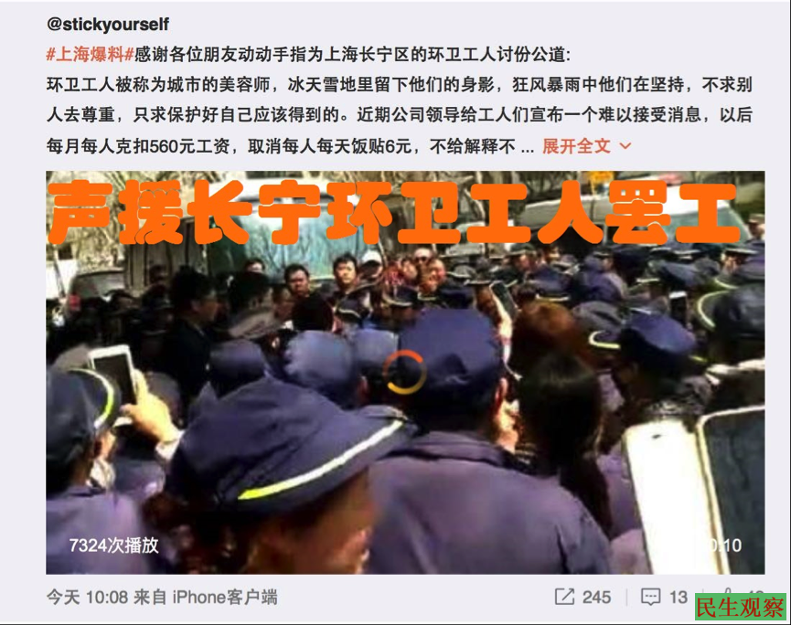 从网络获悉,中国上海长宁区环卫工人为了维护自身基本生存权利从3月26日开始罢工,至今没有得到上海当局的妥善解决,更有参与罢工者被警察殴打致伤或被带走拘押。民生观察对长宁环卫工人罢工保持高度关注与强力声援!