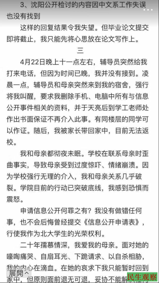 由此信可见,岳昕因行使作为一个公民与北大学生的权利遭到北大当局迫害,以致心身疲惫,感到恐惧而震怒的有关情况。为此岳昕向北大提出了几点诉求:“1、北京大学外国语学院应公开书面说明越过我向家长施压、凌晨到宿舍强行约谈我、要求我删除申请信息公开一事的相关资料所依据的规章制度,对此过程中违法违规操作予以明确,并采取措施避免此类事件再次发生。2、北京大学外国语学院应立即停止一切对我家人的施压行为,向我已经遭受惊吓的母亲正式道歉并澄清事实,帮助修复因此事导致的家庭紧张关系。3、北京大学外国语学院必须公开书面保证此事不会对本人毕业一事产生影响,并不会再就此事继续干扰我的论文写作进程。4、北京大学外国语学院负责消除此事对本人学业、未来就业和家人的其他一切不良影响。5、北京大学外国语学院应明确就以上诉求进行公开书面回复,给关注此事的大家一个交代。”
