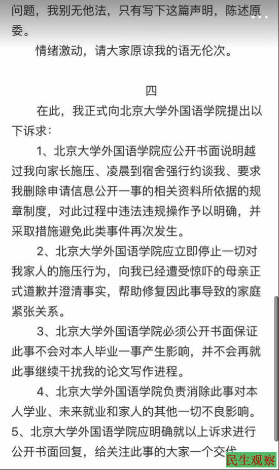 一、北大当局立刻停止对申请信息公开的学生及其家人的打压,并就给学生及其家人造成的伤害公开道歉,无条件答应岳昕所提出的五点诉求;