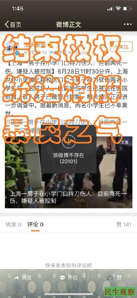据中国官方媒体报道,连日来中国多地接连发生恶性暴力凶杀事件:6月29日,广州大学计算机学院院长谢某将学校科研处罗处长夫妇杀死在校园车库;6月28日,上海世外小学浦北路校区门口一男子持刀砍伤两名小学生与一名成年人,后两小学生抢救无效死亡;6月25日,山东省烟台市一司机开着叉车当街接连叉向车辆,致1人死亡10余人受伤,多辆车受损;6月22日,一男子在西安公交车上刺杀乘客,致2人死亡8人受伤;6月18日,四川省乐山市公交爆炸,致15人受伤。由此可见,中国社会暴戾之气充盈,各种报复性或针对无辜民众的暴力凶杀事件频仍,民众生命安全面临威胁,社会恐怖气氛弥漫,中国整体性危机深重。