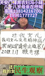据民生观察2018年1月19日消息:江苏无锡访民冯小妹(女)因房屋遭强迫拆迁,于2017年11月9日到天安门裸奔维权,后被警方抓回无锡以“寻衅滋事罪”刑拘,刑拘期满后又被警方强迫做精神鉴定延长羁押。2018年1月17日,冯小妹88岁的老母亲在得知女儿被强迫做精神鉴定后,就走上街头举牌,呼吁江苏无锡滨湖公安分局停止迫害她的女儿冯小妹。
