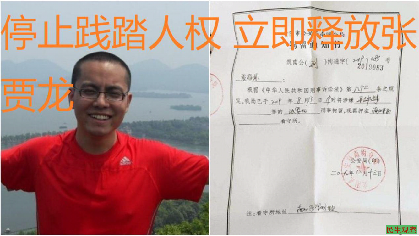据民生观察报道,腾讯财经频道前编辑张贾龙,于2019年8月12日夜晚9时许,被辖区派出所和维稳机关从家中带走,8月13日被贵阳警方以其涉嫌“寻衅滋事”罪刑事拘留,现关押于贵阳南明区看守所。
