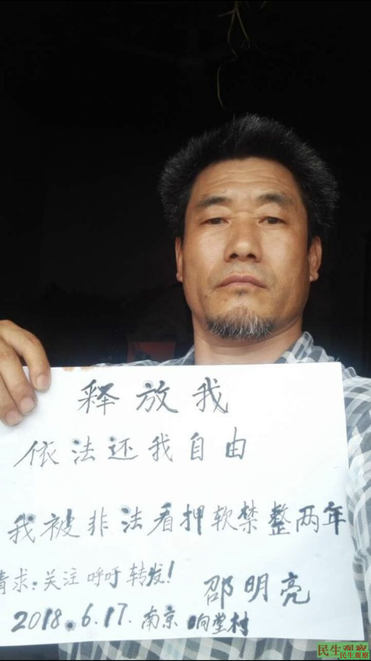 据悉,邵明亮是 南京市浦口区响堂村人,是中国民复党创始人,他因反对马列主义而一直反对共产党专政;他曾于2013年间在南京审计学院大门口、浦口区闹市区、浦口区政府门前举牌宣传宪政、民主、自由、人权遭警察殴打;其后多次被警方送入精神病院关押;2014年1月25日,他在南京浦口区政府门前遭车辆辗压全身(他怀疑车祸为政府幕后指使)而住院医治两年,但仍落下终身残疾(盆骨、骶骨、恥骨、肋骨、脊椎、颈椎、胸骨骨折、头、肺、脊骨损伤),后只能靠轮椅生活;2016年3月、6月他又因反党言论两次被刑拘,其后一直被当局软禁,并且监控他的维稳人员不准他出村,甚至不准他到医院治病,时间长达两年多。