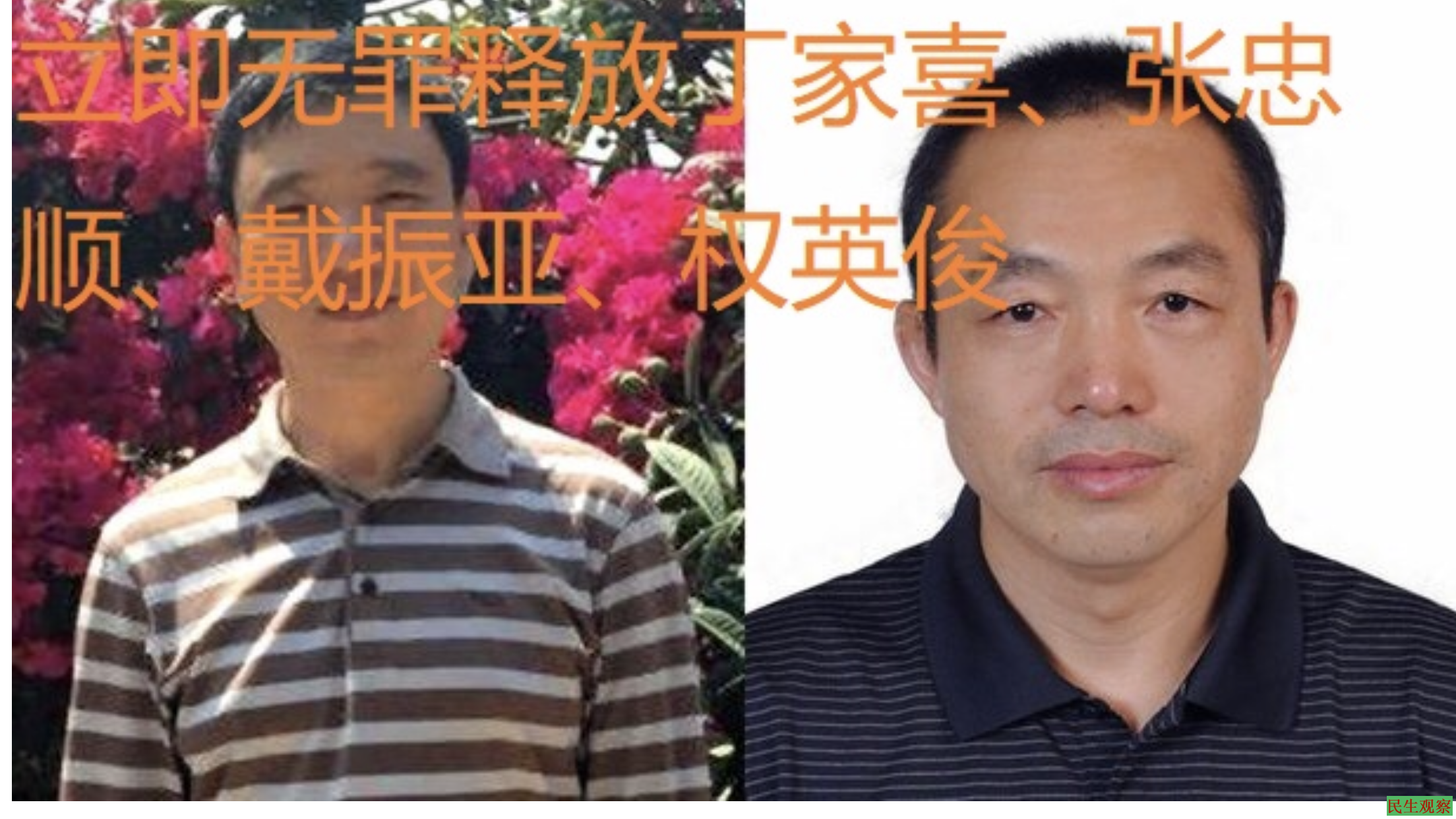 因此,民生观察严正要求中共当局立刻无条件释放丁家喜、张忠顺、戴振亚、李英俊及全国所有为捍卫人权、推进法治而被拘押判刑的维权人士,停止镇压一切公民维权运动,切实落实宪法保障公民权利的承诺。