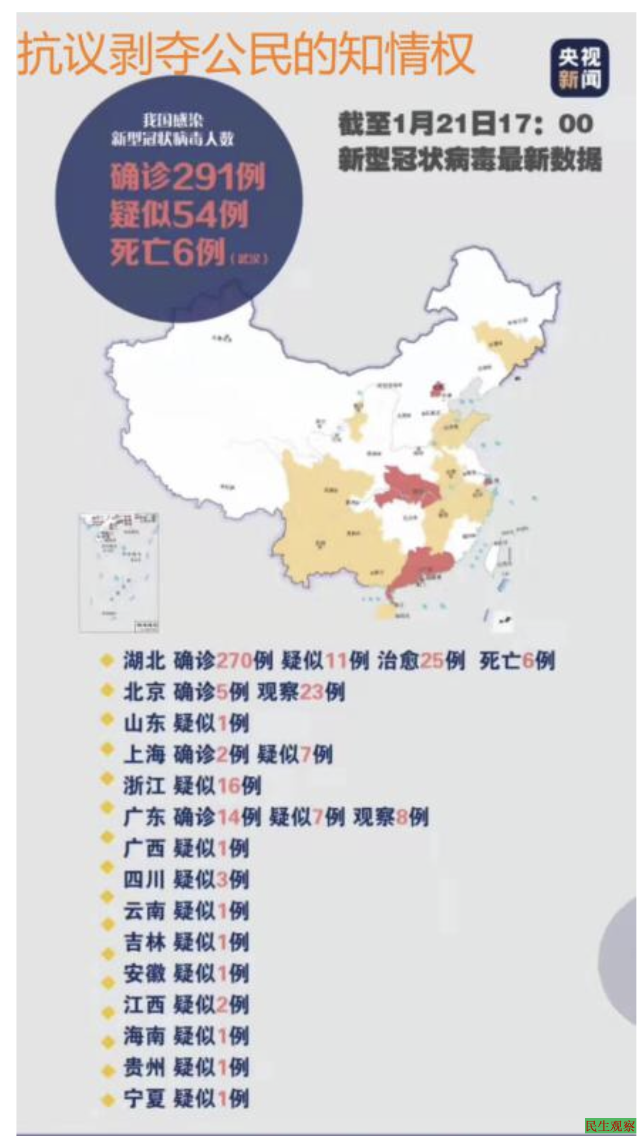 从中共一贯封锁消息与谎言欺世来看,如上的消息未必是真实而准确的。但就算卫计委现在发布了准确消息,其严重性也一目了然。这种新型传染病,溢出武汉,扩散到全国,进而漫延到国外,严重危害人类生命安全的病症,居然在发生地没有及时得到有效控制,居然使国人乃至世界无法得到病情源起与扩散的真实消息,而那些自发起来披露身边消息的公民却遭到警方以传谣追责处罚。至今,导致如此严重灾难后果,危及公民生命安全,显然与中共当局剥夺公民知情权相关。从人类历史无数经验教训来看,事关公民生命安全的公共事务,只有让公民及时全面准确地了解情况,才能更有效调动社会的防范机能,达到最大保障公民生命安全的目的。