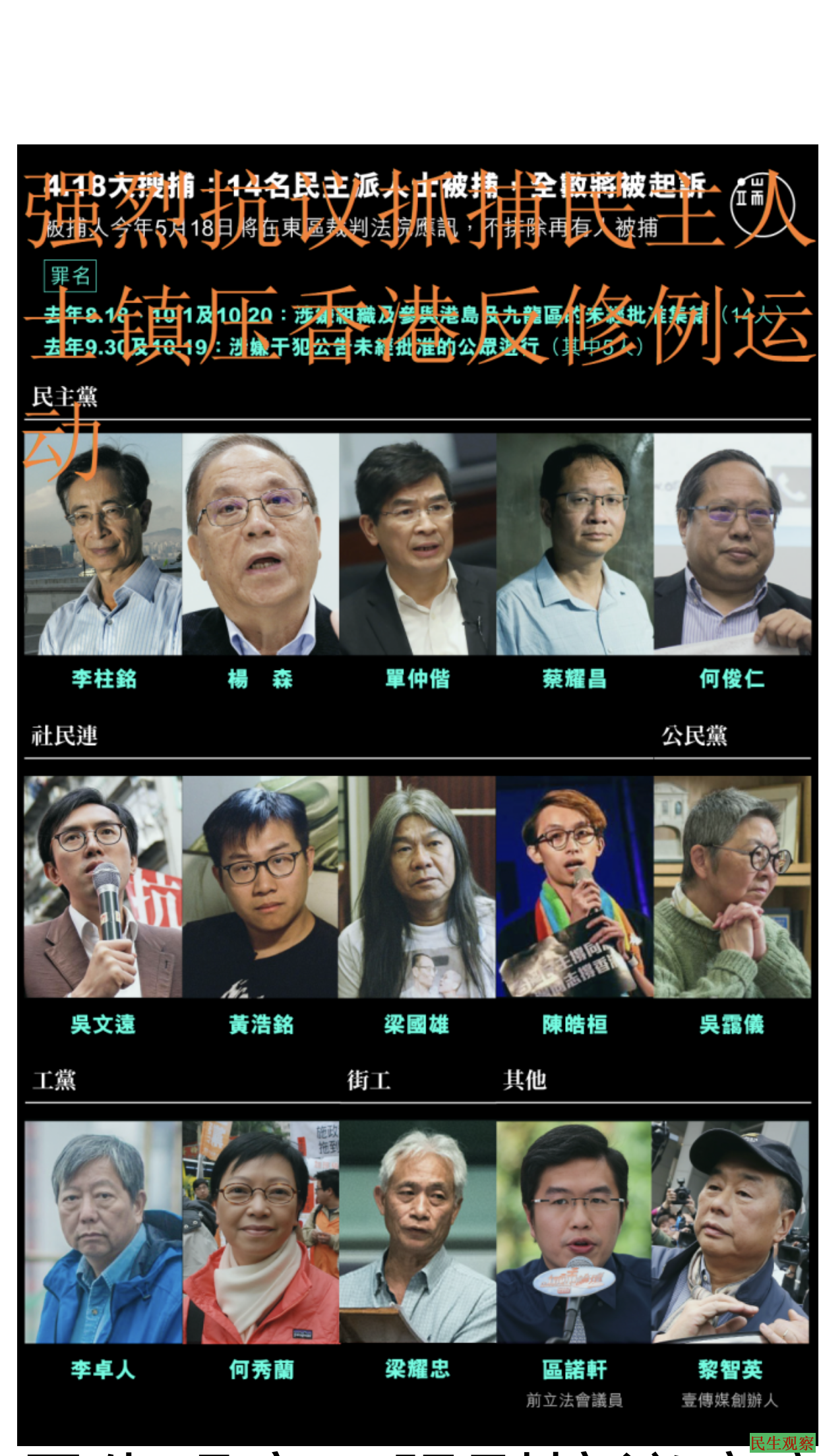 媒体披露,香港警方4月18日早上拘捕15名民主派人士,指他们组织或参与去年8月至10月三次未经批准的游行和集会。被捕人士包括:民主党创党主席81岁高龄的李柱铭、前主席杨森、何俊仁、单仲偕、蔡耀昌、工党李卓人、何秀兰、社民连梁国雄、吴文远、黄浩铭、陈皓桓、公民党执业大律师吴霭仪、前立法会议员区诺轩、壹传媒创办人黎智英,及身兼立法会议员的街工梁耀忠。