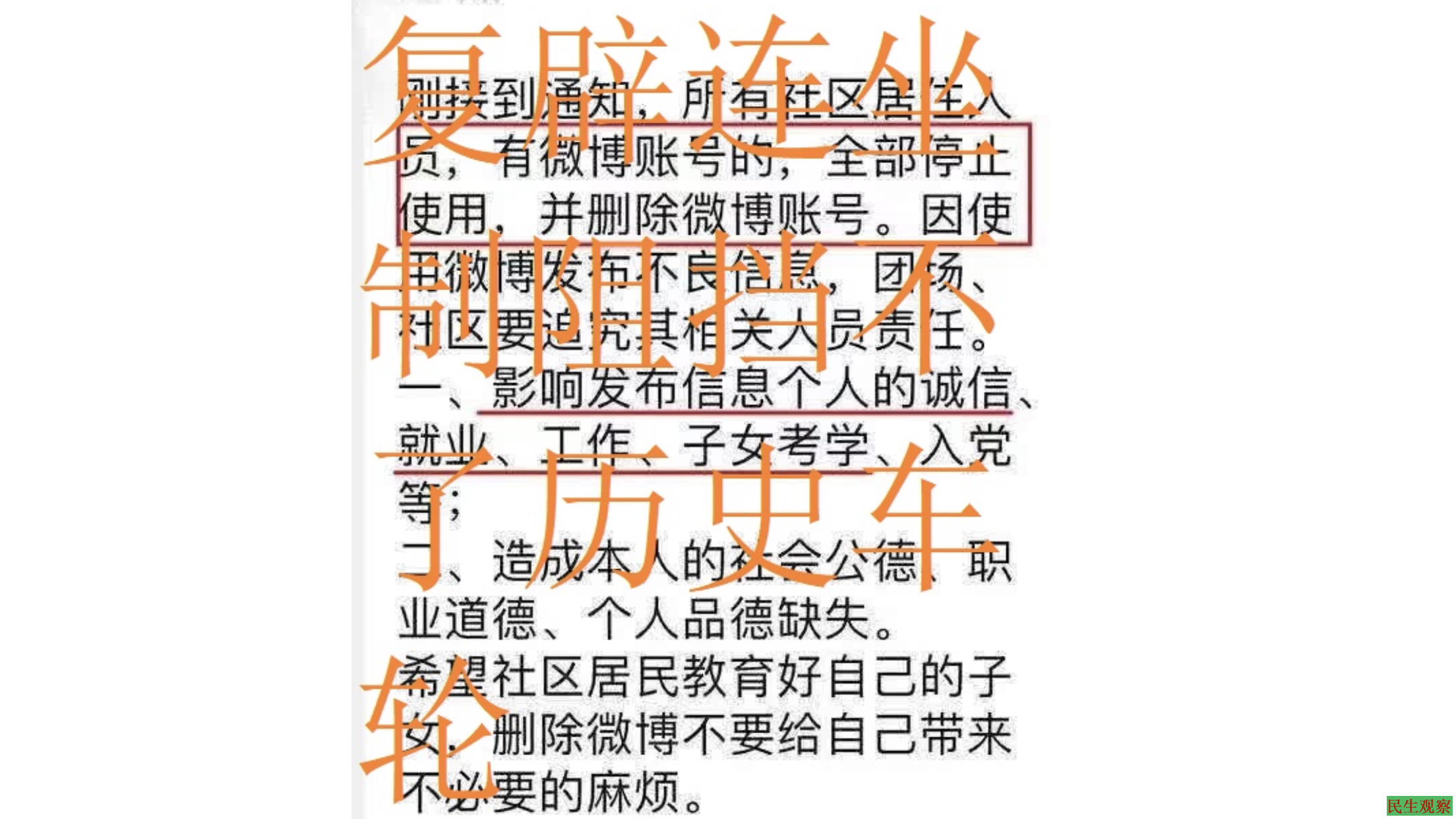 可见中共极权当局今天将一人犯罪全家遭殃的连坐已经制度化、法规化、日常化。一个发微博者的一条微博,就可以殃及自己子女的考学、就业等等。
