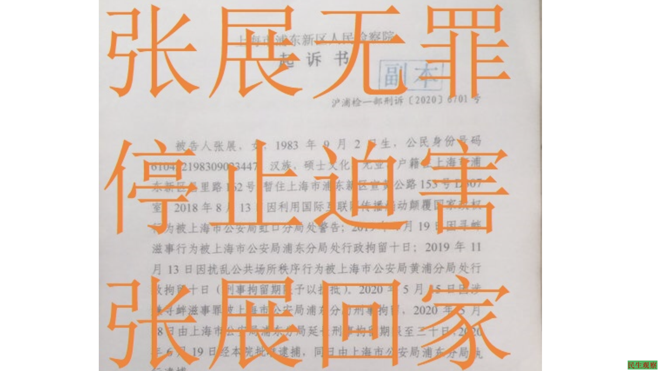 从律师陈述会见情况可以看出,张展身体病弱得变形,在狱中遭受着强制灌食、戴脚镣与约束带等等酷刑。张展被上海检方指控涉嫌“寻衅滋事”,并被建议重判四至五年重刑。而中共公安与检察院列举的所谓罪证,完全是伪造,已经有被列入的所谓证人之一王定邦先生公开发布声明:“本人王定邦虽然懦弱苟且,但还做不出构陷义人的恶行来...一个政府和它的执法者如果不遵循它所制定的法律,执法犯法,以伪造的‘证言’来审判一个弱女子,这样的政府还有合法性吗?我希望有关部门和有关人士知耻后勇,不要做出自掘根基的行为!”