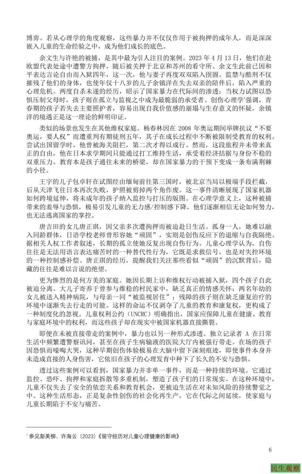 2025年10月9日,世界精神卫生日前夕,中国民间组织“中国人权捍卫者亲友网络”发布了近三万字的专题研究报告——《被连坐的童年:国家暴力下的人权捍卫者子女心理创伤》。这是国内外首次系统性地揭示人权捍卫者家庭子女在国家暴力环境下的处境与心理创伤,报告通过个案访谈与资料梳理,集中呈现了“人权二代”所面对的教育剥夺、社会孤立、心理危机与跨代创伤。