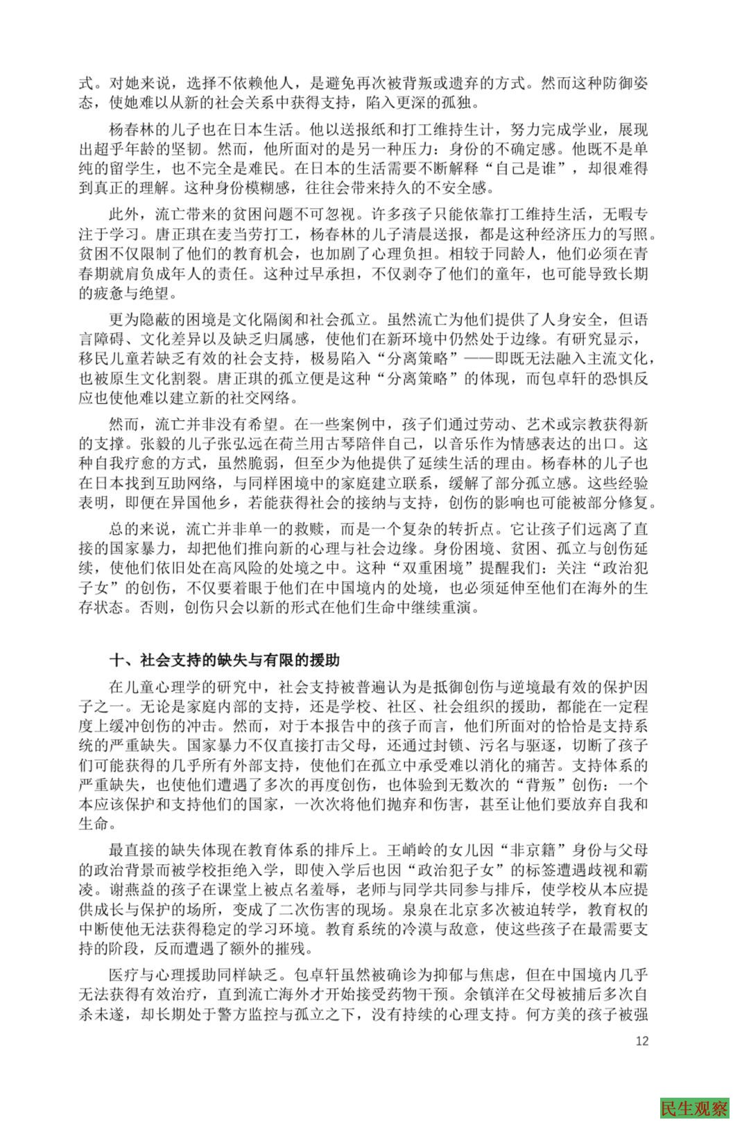 第五,海外流亡并非终点,而是新困境。部分幸运的孩子离开中国,却在异国遭遇新的困难:语言障碍、文化隔阂、身份焦虑、经济拮据,甚至仍旧延续着创伤反应。流亡既是相对安全的开始,也是孤立与困境的延续。