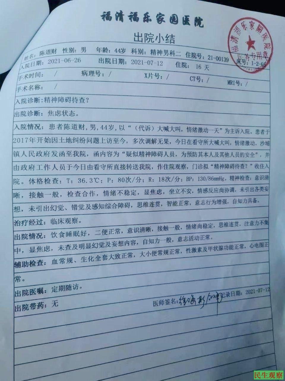 案件来源:福建陈道财因维权被关精神病院牵连孩子就学自由