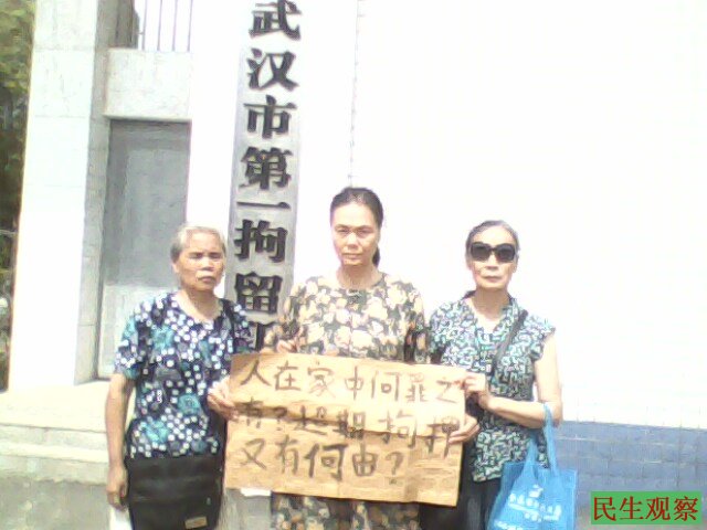 昨天,邹桂兰的拘留期限本来已到,武汉一些上访维权人就来到拘留所准备接人,结果拘留所威胁“再闹”就不放邹桂兰。大家于是不得不离去,直到今天上午11点左右邹桂兰才出狱。出狱后邹桂兰打出“人在家中何罪之有?”的抗议标语。