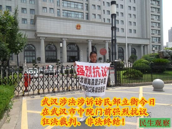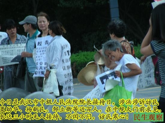 另外,今天是武汉中级法院院长接待日,夏幼华、杨新民、邹立衡等近百访民来到武汉中院希望能见到院长,但访民苦等三小时无人接待。