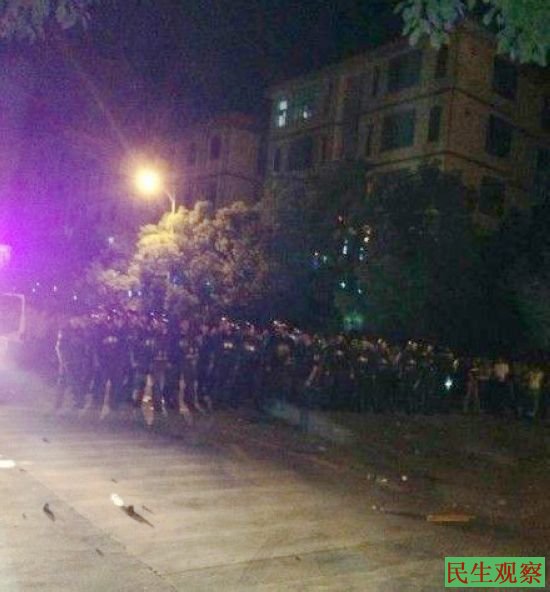 民生观察工作室2013-7-18消息:自昨天湖南省临武县城瓜农邓正加与多名城管肢体冲突后倒地死亡事件发生后,昨夜现场再次爆发湖南警方强抢尸体,肆意暴打驱赶围观群众的恶性事件。据湖南网友爆料:瓜农邓正加与多名城管肢体冲突死亡后,邓的一些家属找来冰柜存放死者邓正加的遗体于死亡现场,其亲属和村民则以冰柜为中心,围在文昌南路的事发现场。而政府方面的工作人员则欲来搬运尸体,被围观人群阻止,警察在发动几轮进攻不果后,纷纷坐在马路上休息。大约到了凌晨4点40分左右,天快亮了的时候,家属以为会和平解决,在没有任何挑衅警方的情况下,警察先冲过来,手持警棍和盾牌,对现场围观者一顿暴打,伤者包括老人和小孩。警方大约出动了200多人,手持电棍、伸缩式警棍,盾牌冲锋至人群,有警察高喊"不让路的就死",且不断敲打他们手中的盾牌轰轰作响,以威胁死者亲属及围观群众。约20分钟后,包括路人和亲属在内的十余名围观者被打伤;死者的大女儿背部、脑袋、胸部被打伤,缝了好几针;一个年轻的路人脑袋被打破到了县中医院去救治。目前有7、8名村民被抓,两辆记者采访车被砸坏。事件最后,人群被警方暴力驱散,警察从冰柜里抬出死者邓正加的遗体后拉走。据悉,邓正加的遗体被拉至南强镇莲塘村进村路口后放下。