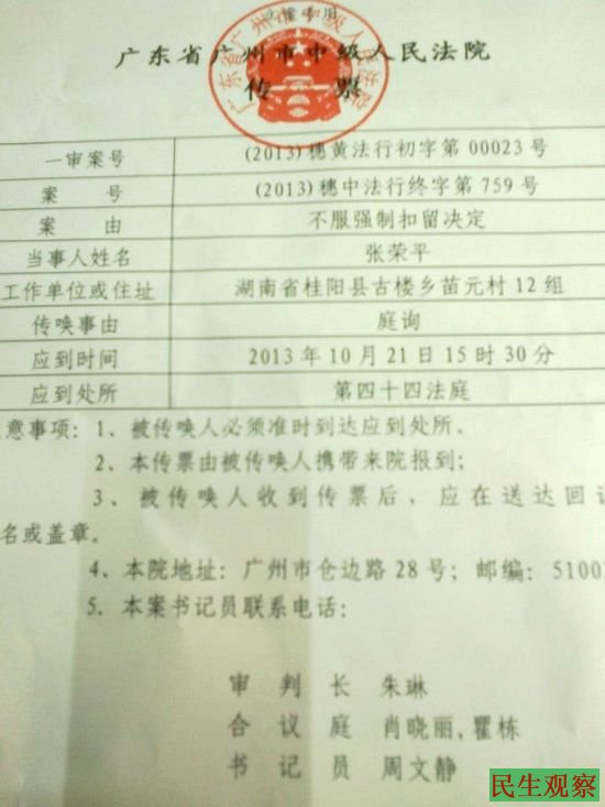 据悉,张荣平从拘留所出来后,对广州市警方对他进行行政拘留的处罚不服,将广州市警方告上了法庭,法院一审的结果张荣平依然不服,就向广东省广州市中级人民法院提起了上诉。昨天,张荣平收到了广东省广州市中级人民法院的《受理上诉案件通知书》和广东省广州市中级人民法院的传票,要求张荣平在2013年10月21日15时30分,到该院第四十四法庭接受该案的审理。张荣平对此说道:“今天,我收到广州市中级法院受理我的行政上诉案件的传票,为推动和见证中国民主与法制建设的进程,欢迎大家到时参加旁听!如果我自己辩护,我就说:‘我藐视独裁政府的法律,随便你们怎么判,我相信历史会给我公正判决。’”