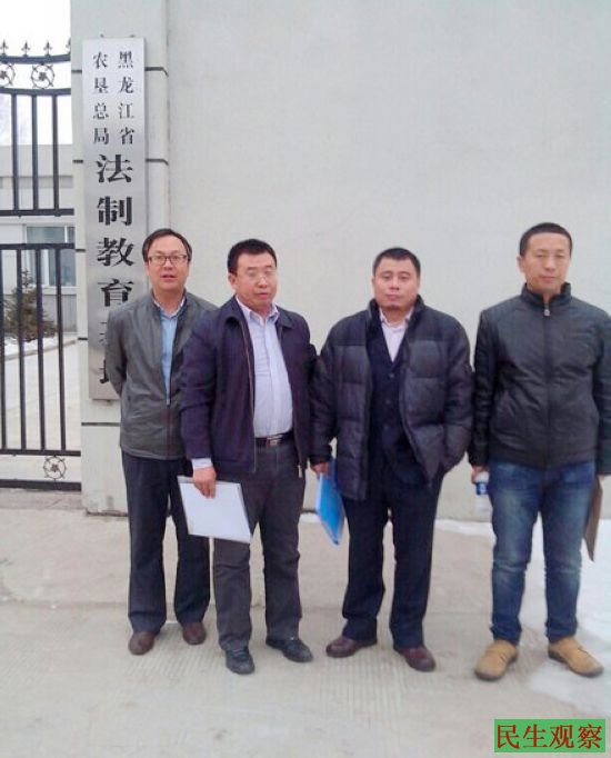 民生观察工作室2013-11-16消息:今天上午本工作室致电维权律师江天勇,他告诉本工作室说,11月14日下午3点,他与唐吉田、梁小军、王成等四位律师,受他的当事人(也是非法拘禁犯罪行为的受害者)于松江先生的委托,抵达"黑龙江省农垦总局法制教育基地"(位于黑龙江省建三江农垦管理局青龙山农场公安分局后院,原属同江市地界,全称"黑龙江省农垦总局法制教育基地",外界称它为“洗脑班”),去实地了解那里“洗脑班”情况。在他们刚刚到达不久,一个叫伊国强的警察带就带着另外4个警察赶来,并欲强行带走他们。这5个警察的带头者叫伊国强,他的警号是:151593;另一个特别态度恶劣的警察姓赵,他的警号是:151482;还有一个警察专门负责摄像;另二个协助领导。在律师们依据相关法律与这5个警察进行了顽强的“唇枪舌战”后,他们理屈词穷的走了,而律师们则继续留在那里呼吁违法关押合法公民的“洗脑班”放人。青龙山那个洗脑班的“领导”叫房跃春,其电话是13846125557;洗脑班的二号“领导”叫陶华,他的手机号是:13555430238; 他们见律师们在门前呼吁他们依法保障公民权利,恢复里面被非法关押的公民人身自由,他们就紧闭大门,死活不肯出来。僵持到了大约5点多钟的时候,该洗脑班对面的警察们纷纷下班,此时,律师们就开始隔着大门对被非法关押在里面的数位公民(石孟昌、韩淑娟、陈敏)喊话:“石孟昌,房跃春他们的这个‘教育基地’非法拘禁你,是一种犯罪行为,你不用害怕,法律会还你一个公道的”;“石孟昌,你82岁的妈妈喊你回家”;“公民韩淑娟、陈敏,回家、回家、回家!”;“房跃春,你们非法关押合法公民这是在犯罪”;“房跃春,请停止你们的犯罪行为,出来我们谈谈”……。但是,洗脑班的大门还是依然紧闭,里面的工作人员死活都不肯出来。到了下午5点半左右,天完全黑了,律师们一直坚持到月6点办才离开。