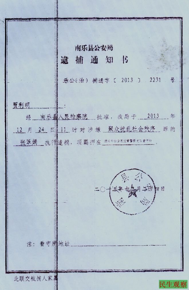 民生观察工作室2013-12-27消息:今天上午,河南南乐张少杰的家人再次联系本工作室说,张少杰三妹张翠娟已被河南省南乐县公安局执行逮捕,并寄来了逮捕通知书。该逮捕通知书显示,张翠娟因涉嫌“聚众扰乱社会秩序罪”于2013年12月24日被逮捕,现关押在河南省濮阳市公安局监管警察支队看守所。