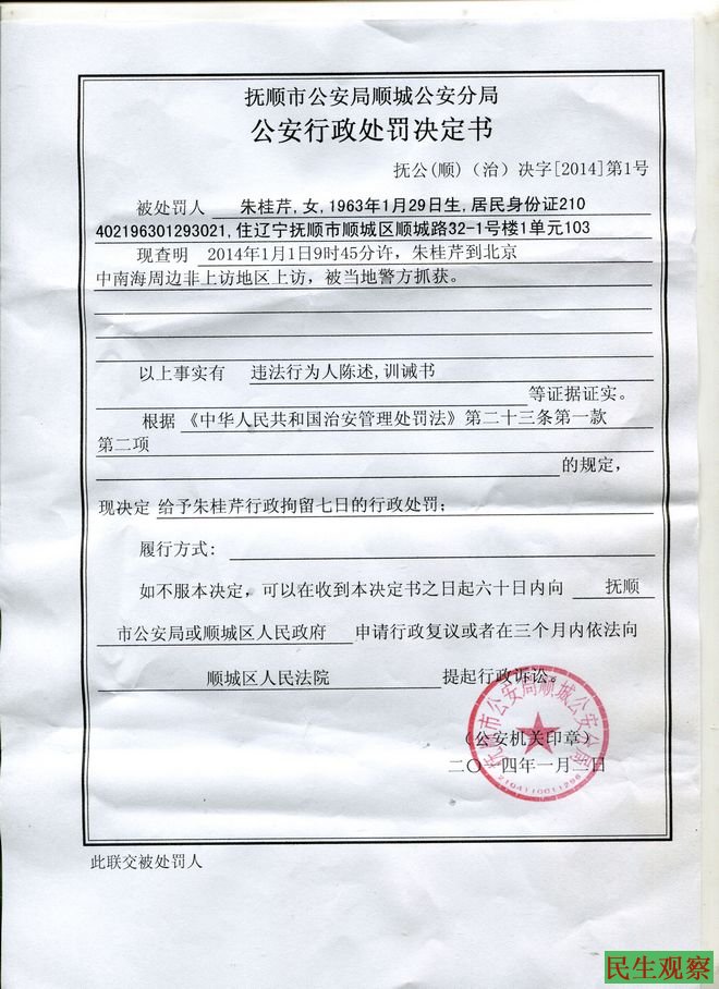 民生观察工作室2014-1-2消息:辽宁抚顺访民朱桂芹今天被抚顺市顺城区公安分局宣布行政拘留七天。据朱桂芹的大姐向本工作室介绍,她们家人已拿到了朱桂芹的拘留通知书,上午朱桂芹已被押到了抚顺拘留所关押。该通知书写道,昨天朱桂芹到中南海周边地区非法上访,扰乱了社会秩序,并受到北京警察的训戒。