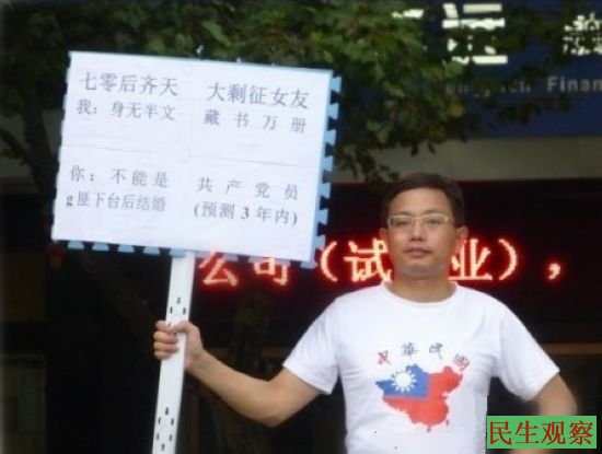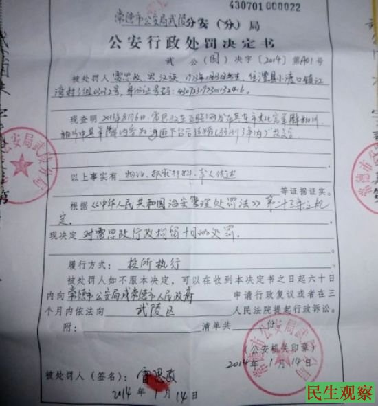 民生观察工作室2014-1-21消息:湖南省常德公民雷思政,因于今年8月间在互联网上发布一张征婚广告图被拘留十日,今天上午他提前“刑满释放”。据湖南网友给本工作室发来消息称,湖南省常德公民雷思政先生,生于1973年,男, 原籍湖南省常德澧县小渡口镇江湾村。雷思政先生多年关注中国的民主宪政问题,同时,他也是湖南公民同城的积极参与者。近期,由于中国当局对公民运动的频频亮剑,他为此而愤愤不平,于是他就在互联网上为这些被捕公民广泛发声。到了元月14日,他就被湖南常德市公安局武陵分局的警方人员带走,并对他处于行政拘留十天的处罚。警方给出的拘留理由是:2013年8月6日,雷思政在互联网发布其在市文化宫举牌相片,相片中其内容:g匪下台后结婚(预测3年内)等文字,根据《中华人民共和国治安管理处罚法》第二十三条之规定,决定对雷思政行政拘留时日的处罚。