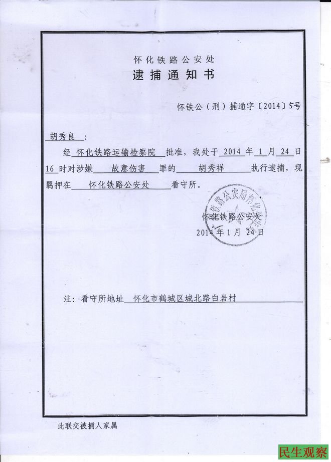 今天本工作室又收到了胡秀祥的逮捕通知书,该通知书是近日才寄至胡秀祥哥哥胡秀良处。通知书显示,胡秀祥已于1月24日被广州铁路公安局怀化公安处,以涉嫌故意伤害罪执行逮捕,现关押在怀化铁路公安处看守所。