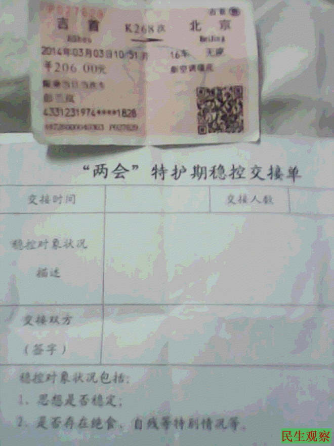 附:彭兰岚的进京车票和“两会”特护期稳控交接单