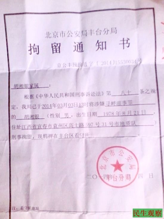 民生观察工作室2014-3-27消息:本工作室今日获悉,江西宜春市维权人士胡湘银先生,于本月3日被北京警方以其涉嫌“寻衅滋事”为由刑事拘留,现拘押于丰台区看守所。