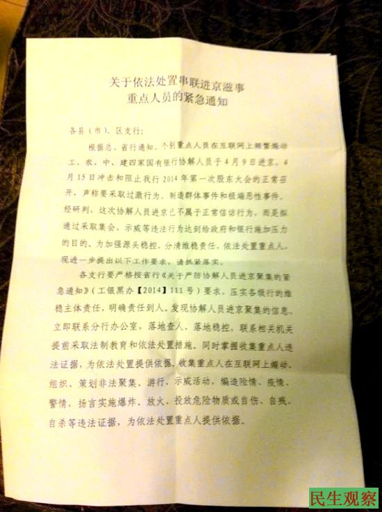 伍丽娟原为湖北潜江工商银行“协解”(协议解除劳动合同)维权人。据了解,工商银行总行将于2014 年4 月15 日(星期二)在北京召开股东大会,总行方面为了维稳,就通知各地下属分行对各自的“协解”维权人员进行稳控。