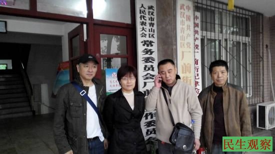 民生观察工作室2014-4-21消息:今天下午,本工作室自武汉公民李勇处获悉,武汉公民王跃、潘建敏、张毅、耿彩文等人,在今天早上冒雨来到武汉市青山区厂前街派出所,寻找因到建三江维权而失踪多时的武汉公民张世清。在大家向警方咨询无果后,就开始在那里继续等待。然而到了下午13时许,大家准备离开去吃午餐时,却遭到了警察的拦阻并限制了他们的人身自由。