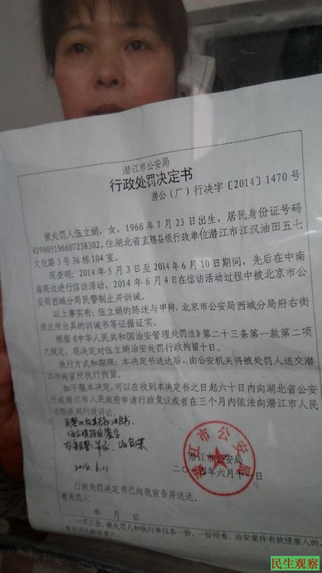 民生观察工作室2014-6-15消息:湖北省潜江市工行维权人士伍立娟6月11日从北京押回后被拘留十天(湖北伍立娟被证实拘留十天