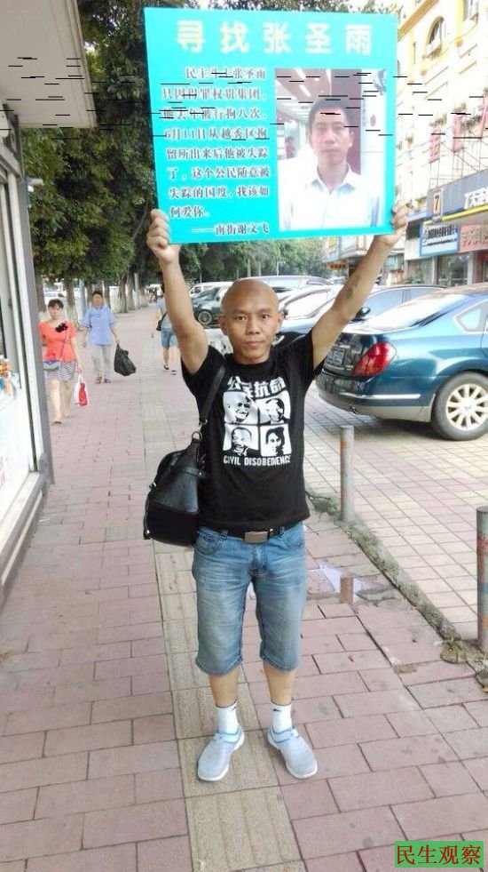 广州民主维权人士谢文飞,因久寻张圣雨未果,就于昨日开始在互联网上刊发广告称:从即日起,我将专职寻找张圣雨,凡我所能到达的地方,包括(但不限于)广州地区的各个派出所、拘留所、看守所、公园、政府门口等处,我将在这些地方以醒目的方式全力寻找张圣雨,直至找到为止。