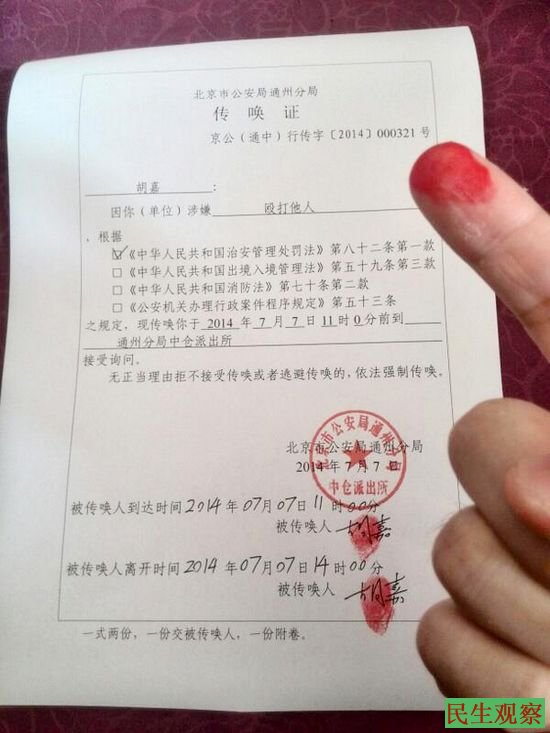 下午18时许,本工作室致电胡佳先生,他告诉本工作室说:是的,今天上午10:00左右,北京警方来到他家,说他们的主管领导要找他“沟通”。随后,他就被带到了北京中仓派出所。到了派出所,他才接到了警方的正式传唤通知,而该传唤通知的罪名却令他瞠目结舌,居然是“涉嫌殴打他人”。