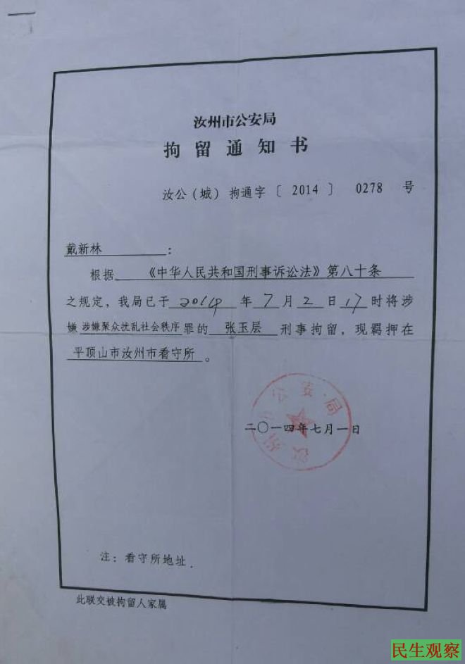 民生观察工作室2014-8-30消息:今天河南汝州访民张玉层的女儿戴紫娟来电说,她的母亲张玉层和老乡吴黑旦7月1日在北京西站下车,到最高人民法院信访接待室反映地方法院不作为,刚到大门口就被汝州市接访人员李秋栋等人阻拦,5个不明身份的人把张玉层绑架上一辆车牌号为(京Q3T137)的汽车押回汝州市公安局遭毒打,身上多处受伤。7月2日还被汝州市公安局以“聚众扰乱社会秩序罪”刑拘,7月18日被汝州市检察院批准逮捕。由于张玉层伤势严重警方把她送医院治疗,在医院治疗期间被戴着脚镣,现已被送到汝州市看守所。