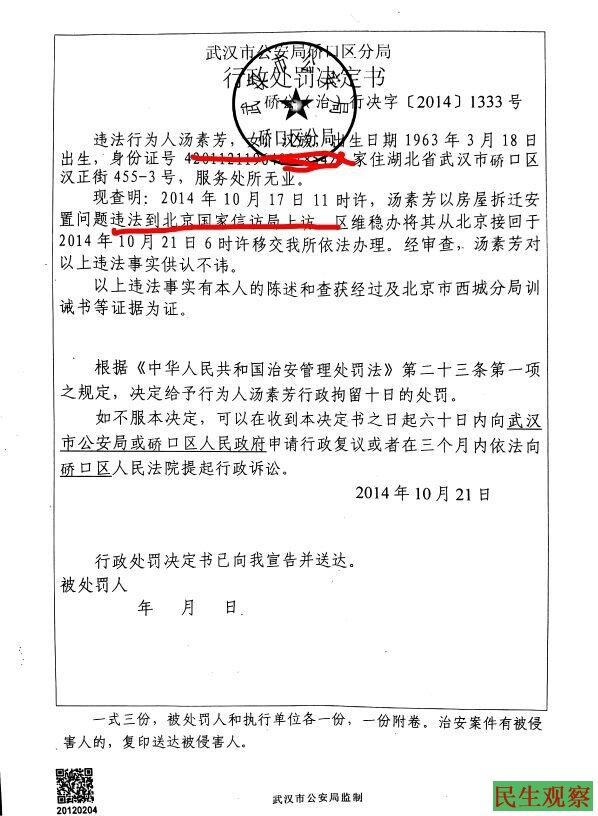 民生观察工作室2014年10月31日消息:汤素芳、余敬是武汉二位拆迁访民,因本月中下旬进京上访,被抓回武汉后,于10月21日均被行政拘留十天。今天二人拘留期满出狱,许多武汉维权上访人前往迎接,以下是相关图片: